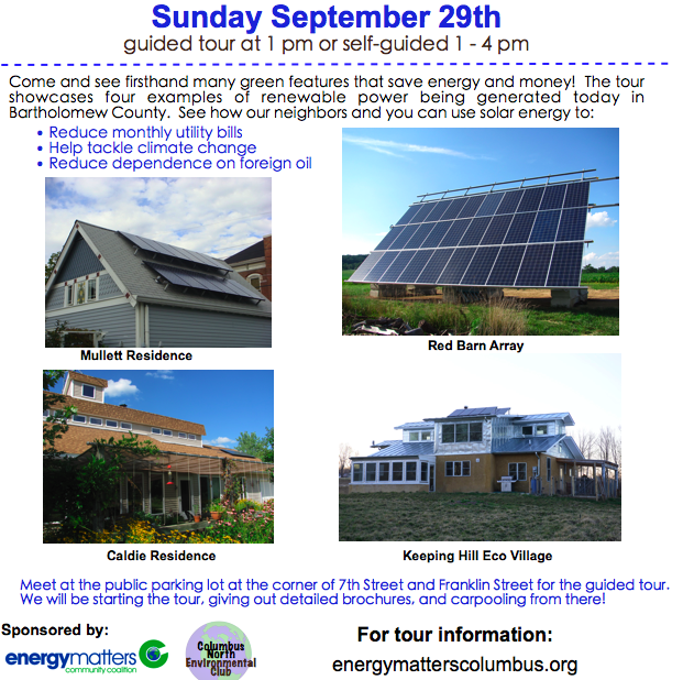 This tour of solar installations was rained out on its original date (9/29), but the new date–Sunday, October 20–promises to be bright and sunny with no chance of precipitation. The hours and the tour route remain the same. The tour hosts have a great story to tell. Take the family for a drive and enjoy the green power along with the fall foliage.